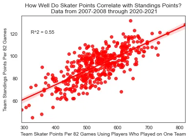 In order to compare the two on equal footing, I first removed all goaltenders, as nobody cares about the number of points a goaltender scores. Using only Skater WAR from 2007–2008 through 2020–2021 leads to an R² of 0.68. By comparison, skater point totals produce an R² of 0.55.