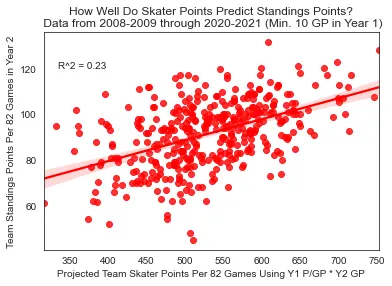 I have to admit, I'm impressed by how well skater point totals hold their own here. They're clearly inferior, but not by the massive margin that I'd expected. This evidence suggests that in the absence of a superior metric, there is absolutely nothing wrong with using points descriptively. With that being said, I do also think it stands to reason that while skater point totals alone do a solid job of describing success at the team level, they're probably much worse at distributing individual credit among skaters on teams than WAR is.