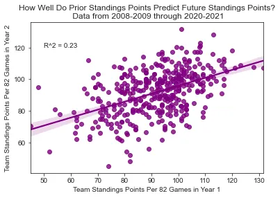 R² = 0.82 — The model explains 82% of the variance in standings points per 82 games from 2007–2008 through 2020–2021.